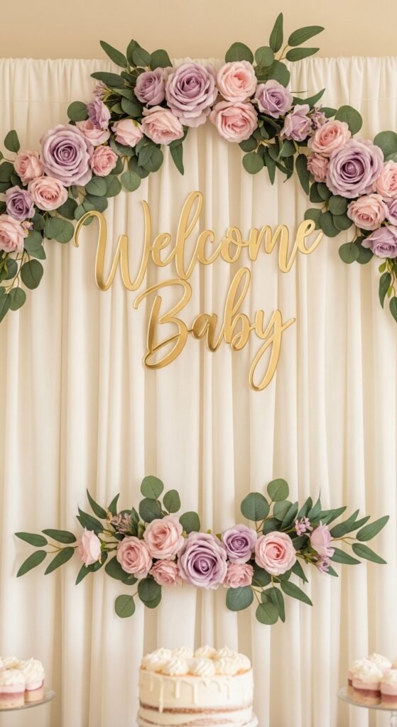 Moving from the rustic charm of woodland themes, refined floral banners bring a completely different kind of magic to your baby shower celebration. Think soft watercolor roses paired with classy calligraphy designs that spell out “Welcome Baby” in flowing script.