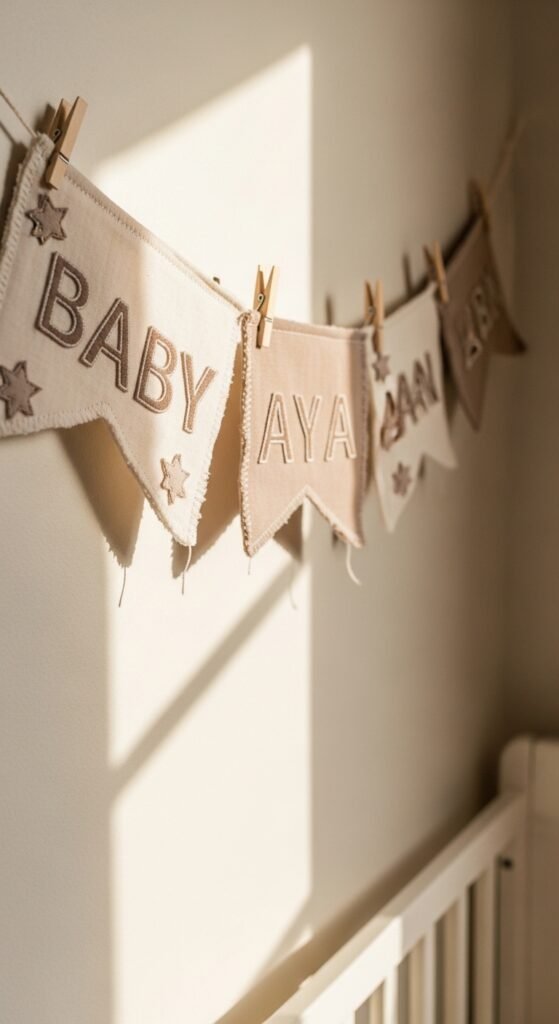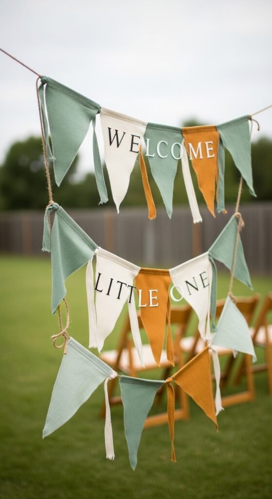 Minimalist geometric designs shine in neutral themes. Try triangle bunting in earthy tones or simple hexagon patterns. Messages like “Hello Baby,” “Welcome Little One,” or “Bundle of Joy” keep things sweet and inclusive while letting your chosen colors do the talking.