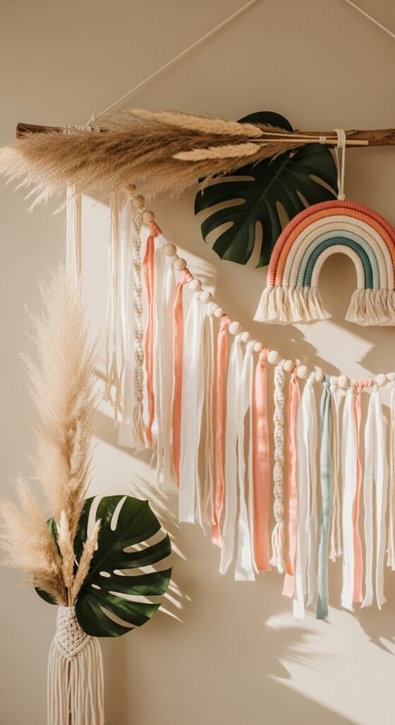 Mix textures by combining fabric triangles, wooden beads, and tassels. These styles work especially well for outdoor showers or modern nursery themes.