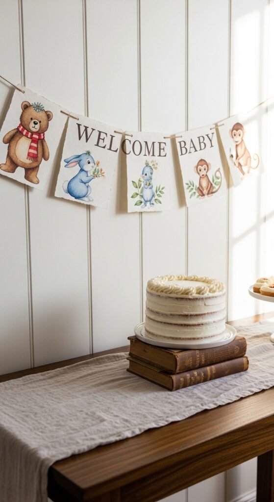 Classic book character banners featuring Winnie the Pooh, Peter Rabbit, or Curious George create instant recognition and warmth. I’ve seen these work beautifully across dessert tables or photo backdrops.