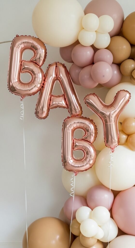 Balloon letter banners metamorphose any baby shower space into an Instagram-worthy celebration that’ll have everyone reaching for their phones. You can spell out “BABY,” the little one’s name, or sweet phrases like “Oh Baby!” using individual letter balloons.