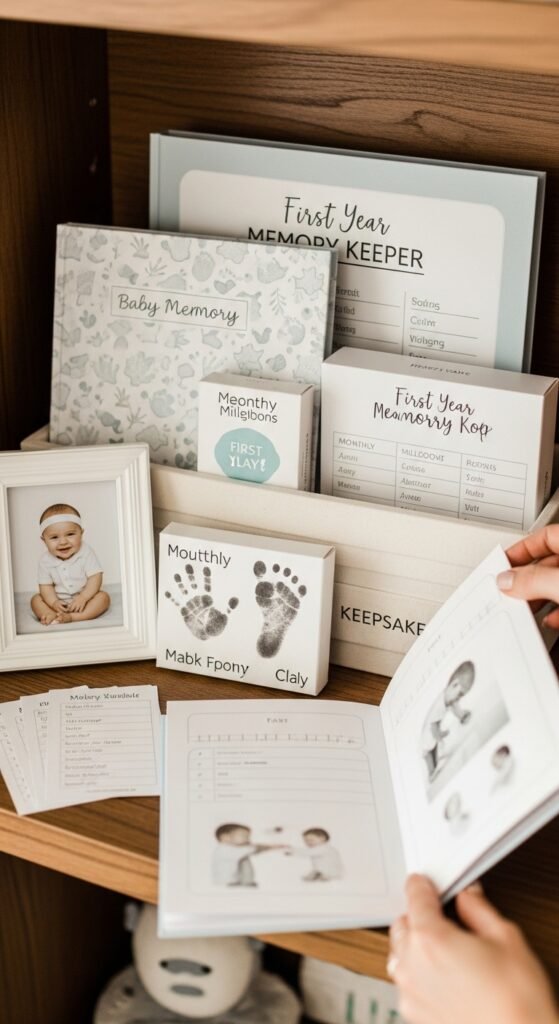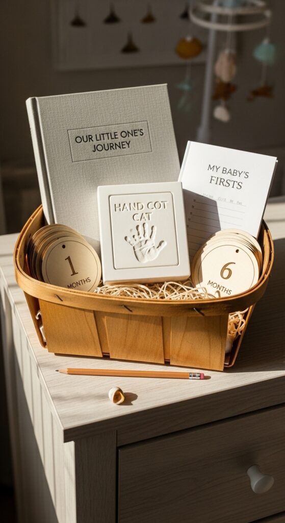 Include a beautiful baby book with monthly milestone pages, handprint and footprint clay kits, and a “first year” photo frame set. Add monthly milestone cards for adorable photo shoots and a small keepsake box for storing hospital bracelets and first outfits.