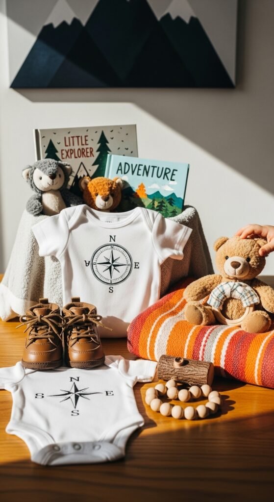 Start with a cute compass-themed onesie and hiking boot booties. Add wilderness themed decor like forest animal plushies or mountain wall art. Include campfire inspired accessories such as an orange and red striped blanket or wooden teething rings that resemble tiny logs.