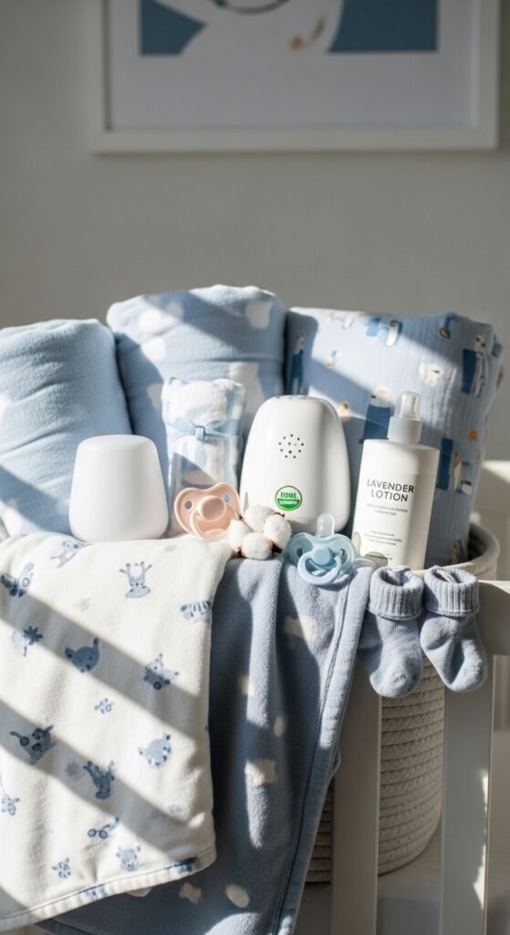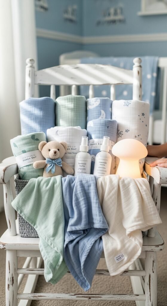 Include cozy sleepy blankets in soft blues or gentle patterns – I always recommend organic cotton or bamboo blends since they’re breathable and gentle on sensitive skin.
