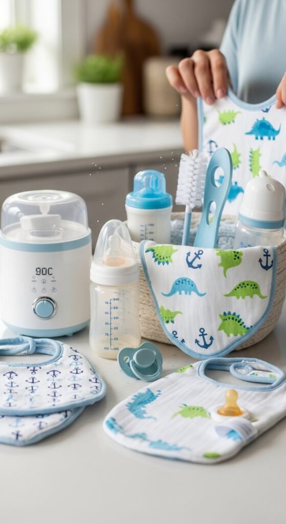 Since feeding becomes the center of daily life with a newborn, you’ll want to stock up on essentials that make mealtime smoother for both baby and parents. Include a portable bottle warmer – trust me, cold formula at 3 AM isn’t fun for anyone.