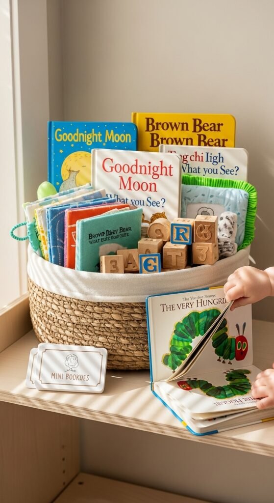 Fill your basket with board book classics like “Goodnight Moon,” “Brown Bear, Brown Bear,” and “Where the Wild Things Are.” These sturdy books can withstand tiny hands and inevitable teething moments.