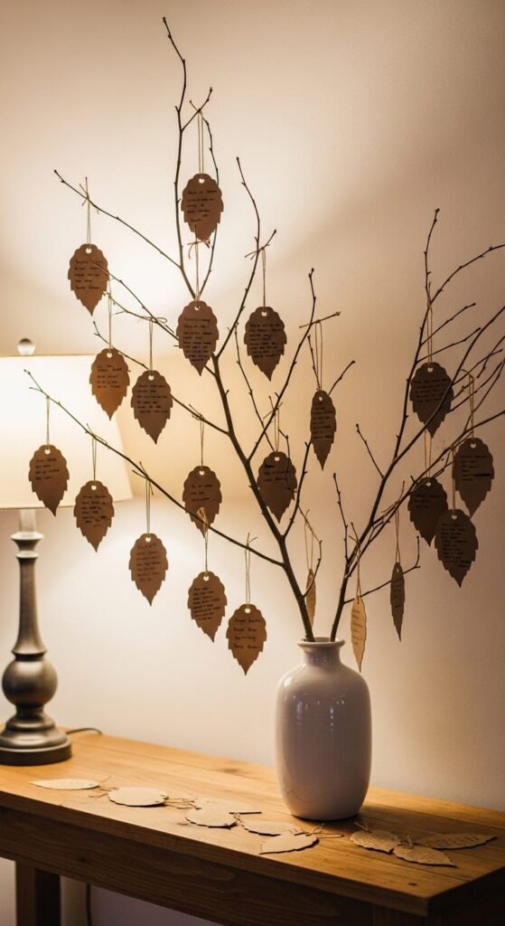 Set up a decorative branch in a weighted vase, then provide leaf-shaped cards for guests to write wishes and advice. They’ll hang their heartfelt messages directly on the branches, creating an instant keepsake you’ll treasure forever.