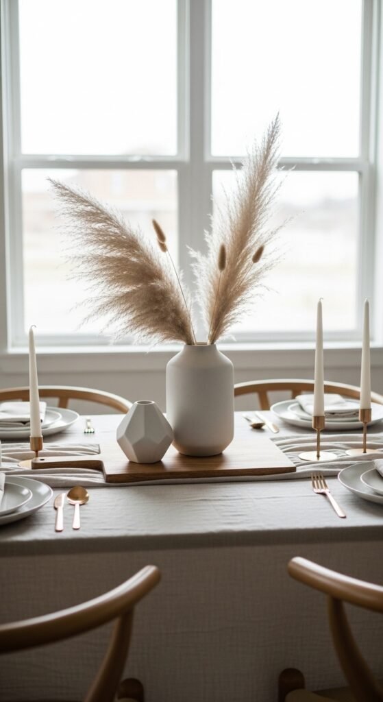 Focus on simple geometric shapes for your centerpieces. I love using triangular plant holders or hexagonal serving trays that add visual interest without overwhelming the space. Natural wood accents work beautifully here—consider wooden high chairs, bamboo plates, or cedar serving boards.
