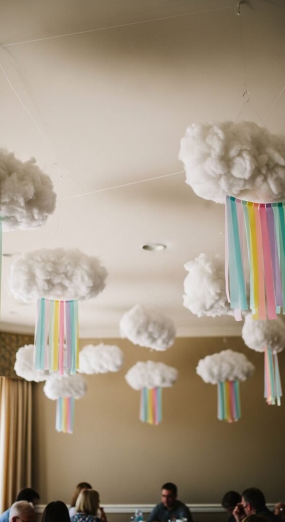 For fanciful rainbow hangings, try streamers in ROYGBIV order or paper cutouts. Pro tip: position rainbows so they appear to emerge from your clouds. The effect changes any room into a magical wonderland that’ll have guests looking up in amazement throughout your celebration.
