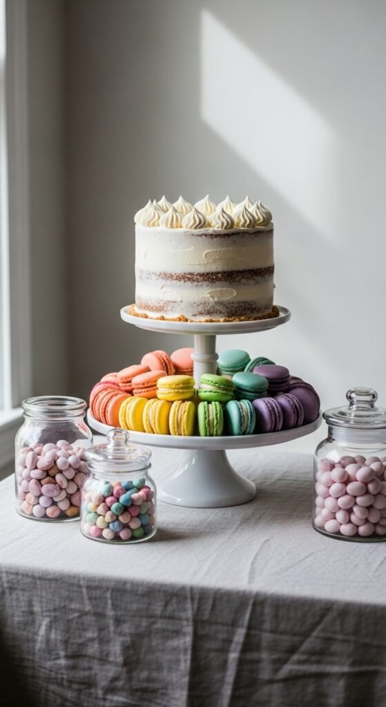 Create a stunning pastel macaron display using clear acrylic boxes or vintage cake pedestals. Arrange them by color gradient for that Instagram-worthy effect.