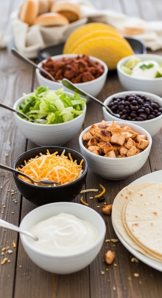 Set up a DIY toppings bar with simple proteins like seasoned ground beef, grilled chicken, or black beans. Arrange fresh lettuce, diced tomatoes, shredded cheese, and sour cream in separate bowls. Don’t forget tortillas and bread rolls!