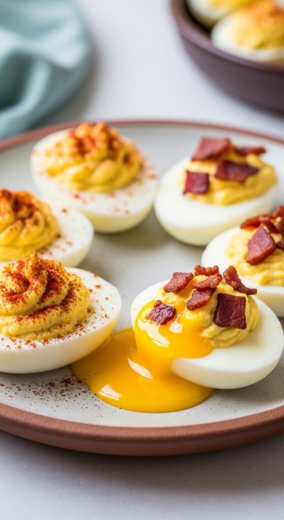 Top half your eggs with bacon bits for smoky crunch—buy them in bulk to save money. The other half gets a classic paprika garnish for beautiful color contrast. You can prep these a day ahead, which saves precious party-day time. Your guests won’t believe something this impressive costs under five dollars.