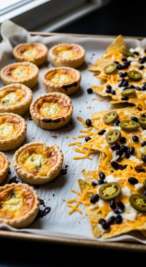 Sheet pan nachos work brilliantly too. Layer tortilla chips, cheese, and beans on parchment paper. Bake until bubbly, then top with salsa and sour cream. Everyone loves these crowd-pleasers!