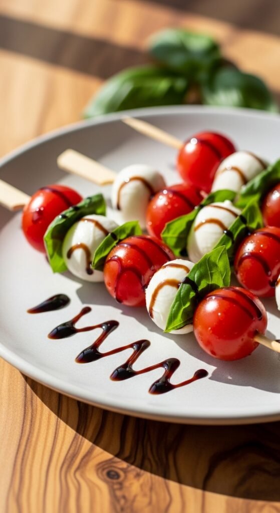 I love how these showcase fresh ingredients without any fuss. You’ll simply alternate the components, creating lively red, white, and green patterns. A light drizzle of balsamic glaze adds that perfect tangy finish.