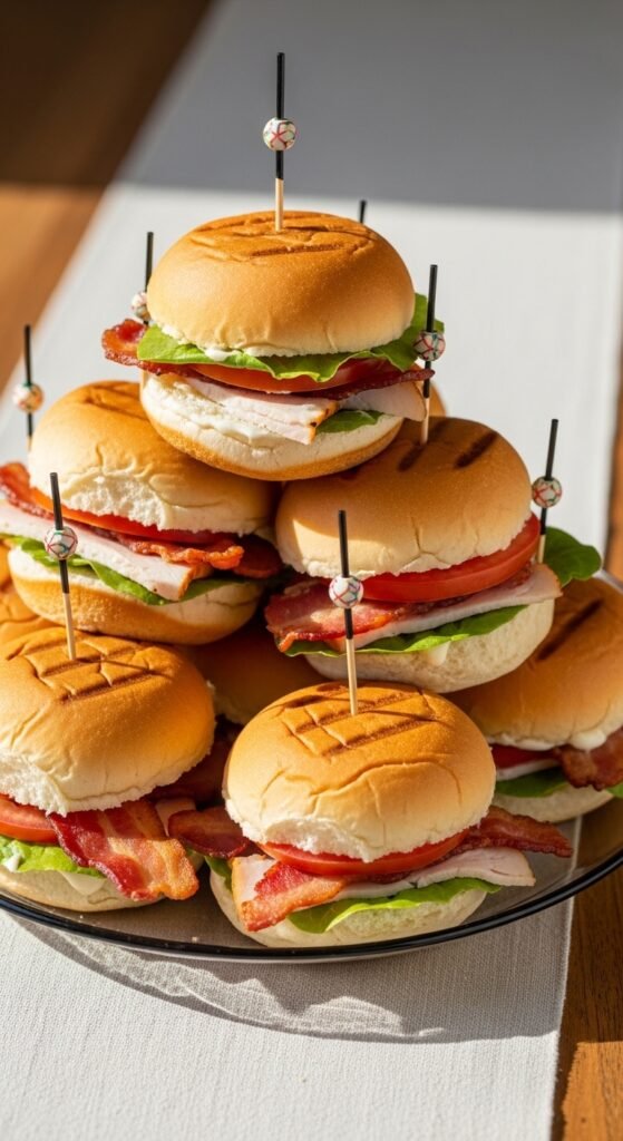 I’ve found that using soft dinner rolls or slider buns creates perfect finger sized portions that won’t overwhelm your guests. Layer thinly sliced turkey, crispy bacon, lettuce, and tomato with a light mayo spread.