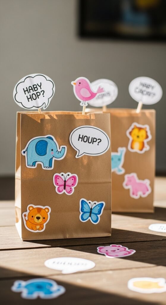 Pro tip: Create homemade embellishments by drawing simple speech bubbles near the animals with sweet messages like “Welcome baby!” The contrast between rustic brown paper and colorful stickers creates unexpected elegance.