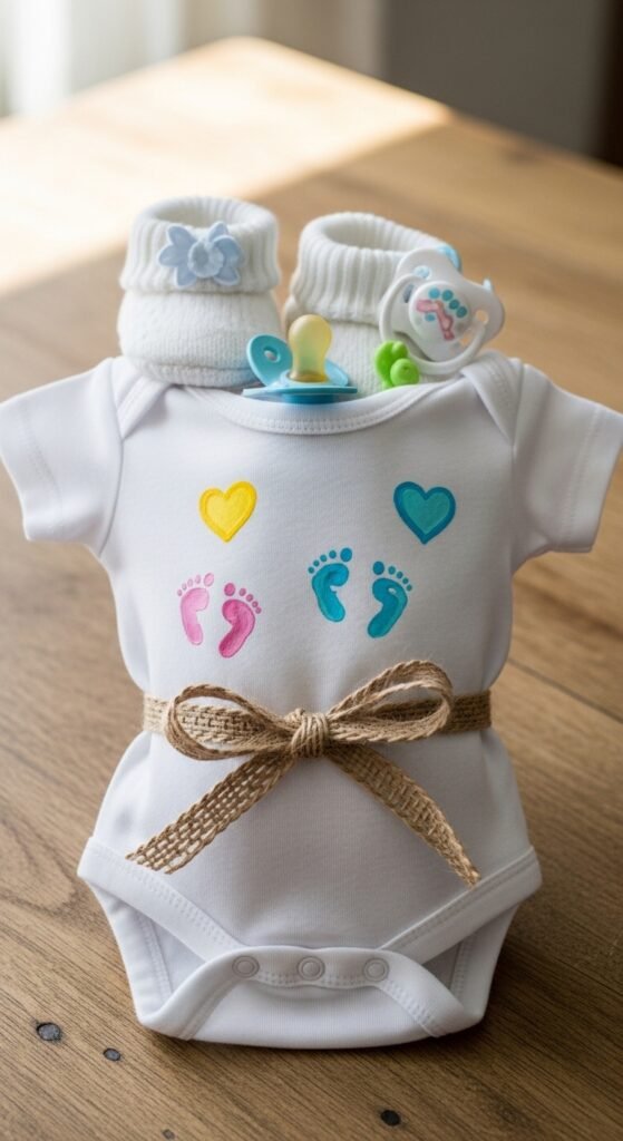 You’ll start with plain white onesies as your canvas. For painted onesie designs, use fabric paint to create simple hearts, stars, or footprints. Let them dry completely before stuffing with smaller items like socks or bibs.