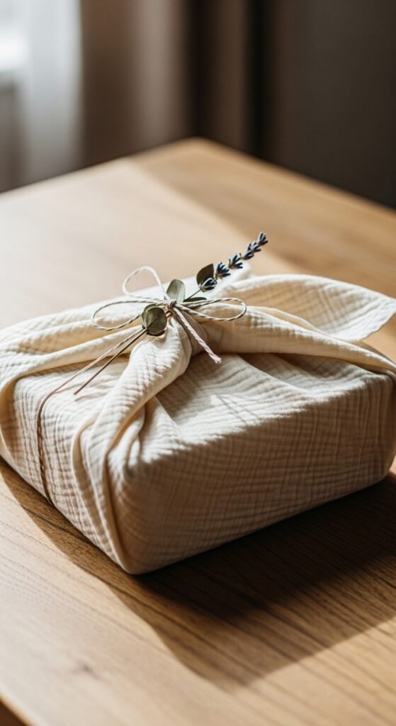Moving beyond paper options, fabric wrapping opens up a world of sustainable possibilities that double as keepsake gifts themselves. You’ll love how soft muslin creates beautifully draped fabric wrapped gifts that parents can later repurpose as burp cloths or swaddle blankets.