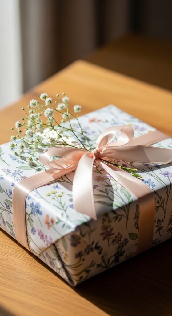 Choose pastel floral prints with roses, peonies, or wildflowers as your base. Then, tuck small sprigs of baby’s breath under your ribbon or tape them directly onto the package. These refined floral accents change ordinary gift wrap into something magical.