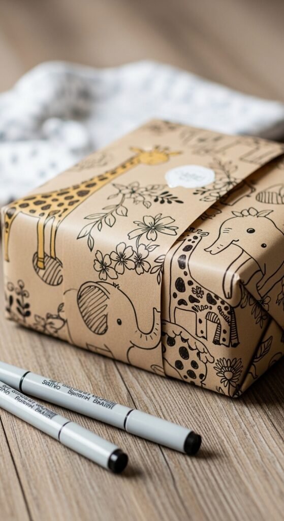 While store-bought wrapping paper surely has its place, there’s something incredibly special about creating your own kraft paper magnum opus with hand-drawn baby illustrations.
