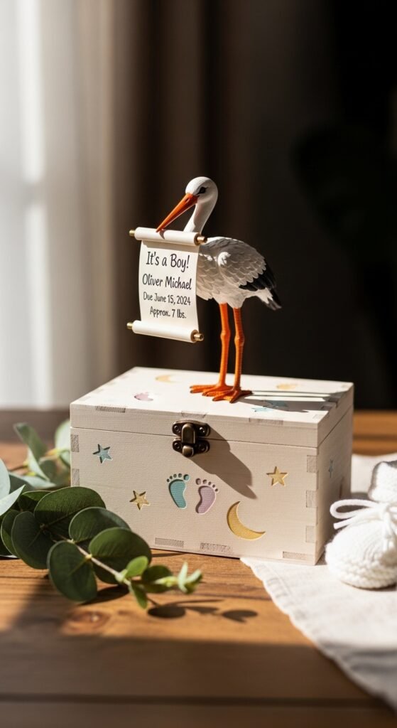 That’s where the stork delivery box comes in – it’s basically theater for baby gifts. I love altering plain white boxes with stenciled baby motifs like rattles, bottles, and tiny footprints around the edges.