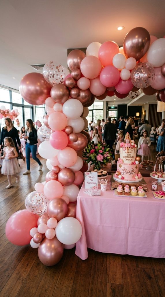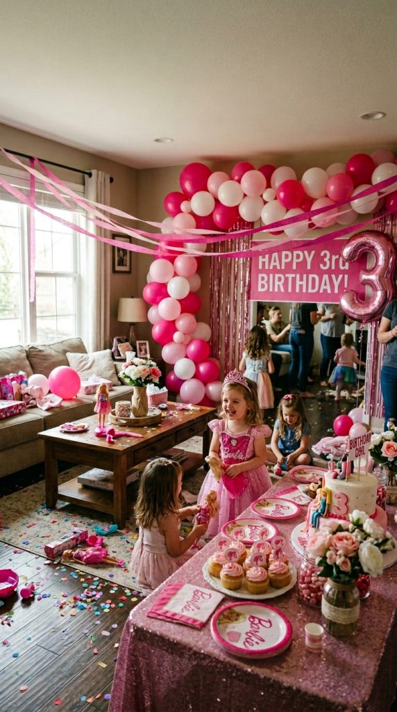 Letter banners spelling “Happy Birthday” in hot pink font pull everything together beautifully. Don’t overlook the floors either — pink balloon clusters at ground level create that immersive, walk-into-Barbie’s-world feeling every three-year-old absolutely deserves. For the dining area, Barbie party table ideas with pink accents and stylish tableware can elevate the overall look and tie the entire theme together seamlessly.