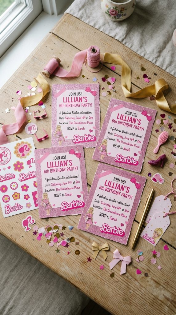 Pink fonts, glitter accents, and Barbie-inspired imagery make these invitations feel special. Parents will actually save them — that’s how good they look. From bold glamorous Barbie-themed designs to minimalist chic styles, there’s a wide range of invitation aesthetics to match the exact vibe you’re going for.