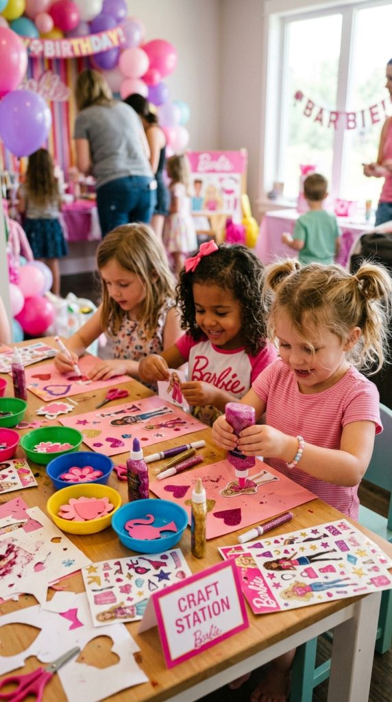 Craft time is where the real magic happens at a toddler party — and the good news is, it doesn’t have to be complicated. Set up a simple station with glitter glue and pre-cut Barbie shapes, letting your little guests decorate freely. They’ll feel incredibly proud of their creations.