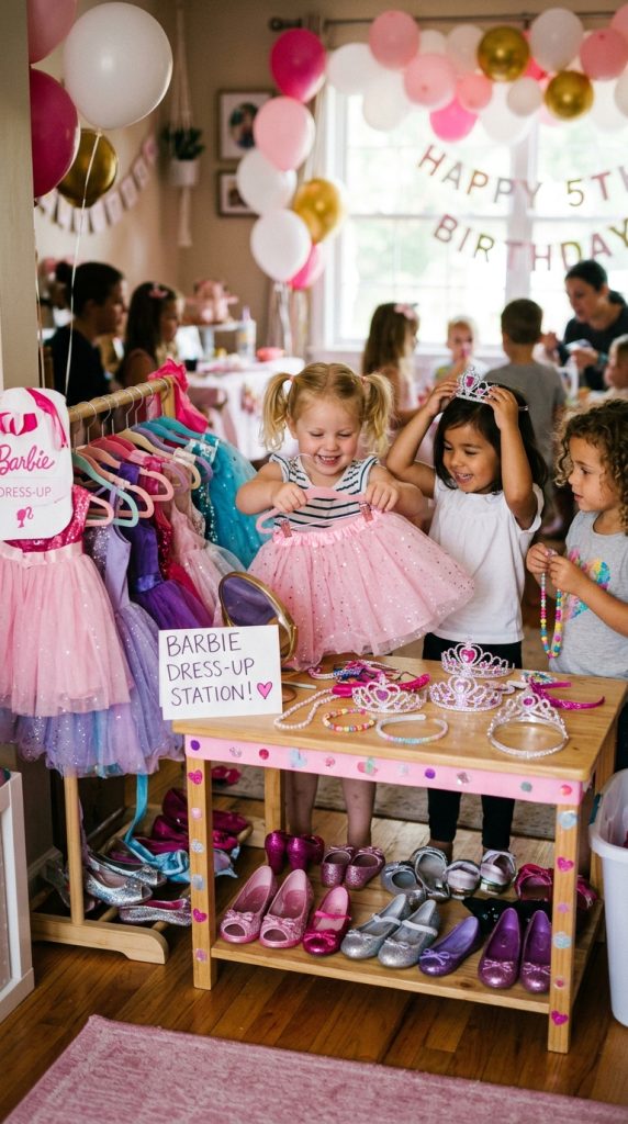 Once the games wind down, you’ll want something that keeps the magic going without requiring much adult supervision — and a Barbie dress-up station does exactly that.