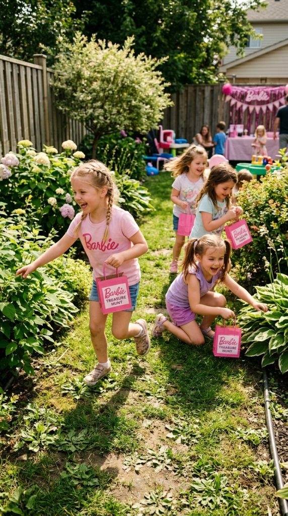 Try a Barbie treasure hunt where you hide small Barbie accessories around the yard. Give each child a pink bag to collect their finds. It’s low-pressure and genuinely exciting for little ones.