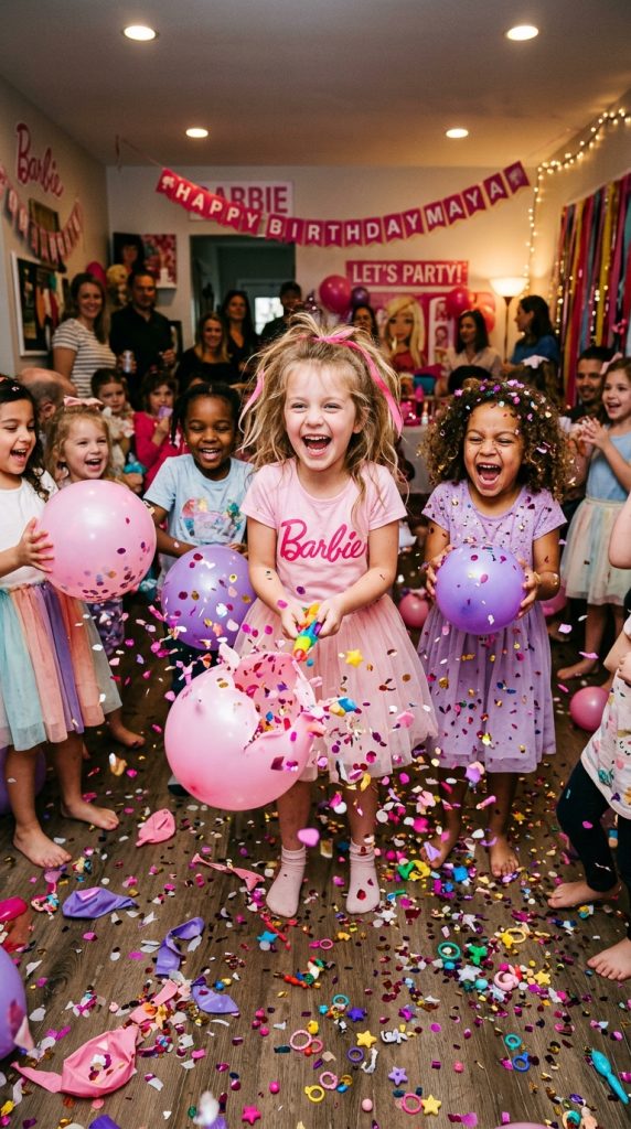 A balloon pop game works beautifully too. Stuff pink and purple balloons with tiny Barbie-themed prizes, then let kids stomp them open. They’ll absolutely lose their minds with excitement.