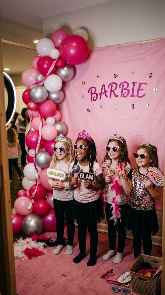 A Barbie Dream House photo booth is one of those party additions that looks impressive but doesn’t require much effort to pull off. Hang a pink backdrop, add some balloon animals, and scatter a few fun props around.