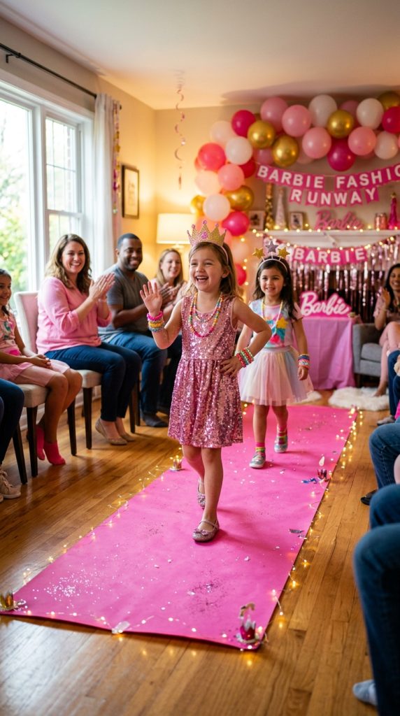 Every Barbie party needs one showstopping moment, and a mini runway walk delivers exactly that. Roll out a pink paper runway down your hallway or living room, crank up some upbeat pop music, and let each child strut their stuff.