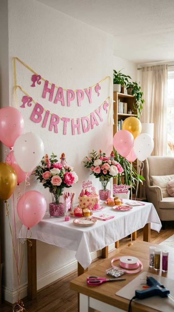 Grab pink cardstock, glitter glue, and ribbon to craft handmade banners spelling “Happy Birthday” in bold, bubbly letters. They look expensive but cost almost nothing.