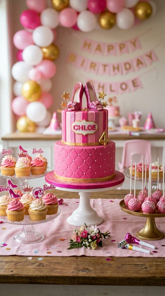 Choose cake designs that feel bold and unmistakably Barbie — think hot pink tiers, edible glitter, and tiny plastic heels on top.
