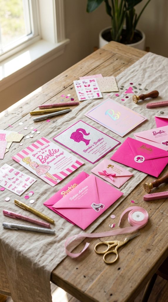 Formal invitations feel special — think pink envelopes, glittery Barbie graphics, and a little card kids actually hold.