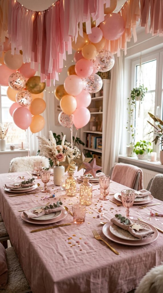 Hang pink balloons in clusters at different heights to create visual depth. Add glitter centerpieces on each table — think Barbie silhouettes or star shapes — to catch the light beautifully.