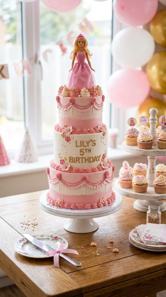 The cake is honestly the crown jewel of any 5th birthday party, and a Barbie-themed one? Pure magic. You can go classic with a doll-shaped cake featuring Barbie fashion designs as the frosting skirt—it’s always a showstopper.