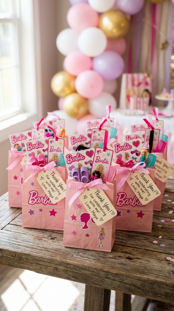 Fill small pink bags with Barbie souvenirs like mini accessories, lip gloss sets, or personalized keychains.