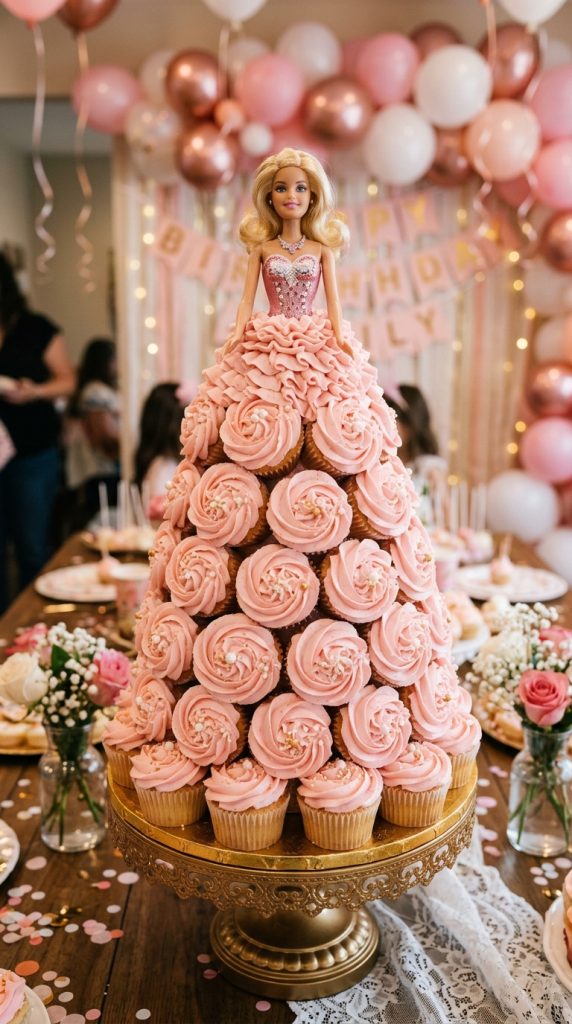 These cupcakes fit perfectly into a chic Barbie party theme that keeps everything looking dreamy and coordinated.