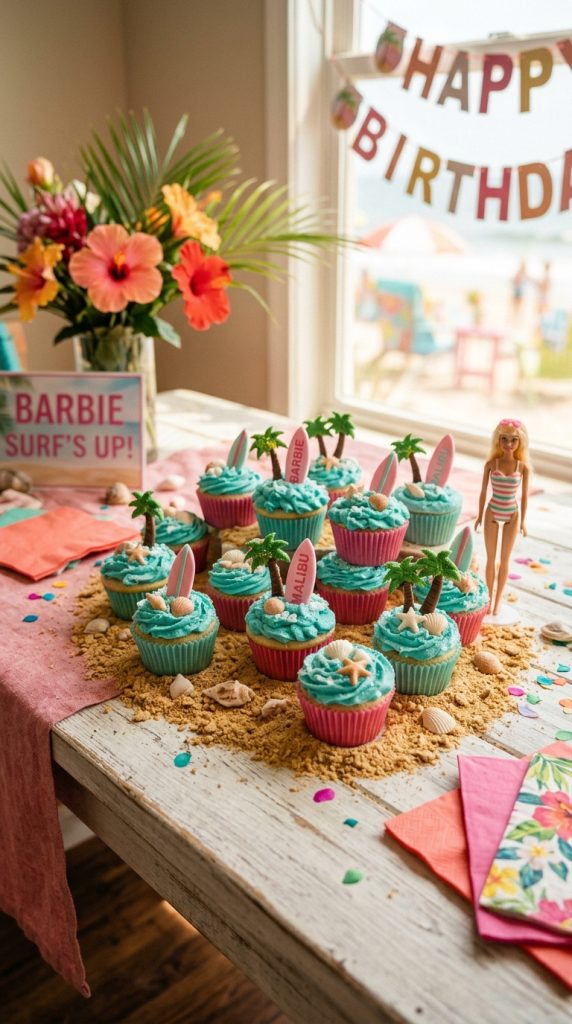 Top each cupcake with a miniature Barbie sunbather or palm girl tree pick for instant beach vibes.