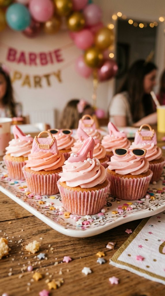 The tiny Barbie accessories trend is honestly where cupcake decorating gets really fun. You can top each cupcake with miniature high heels, tiny handbags, or little sunglasses for an instantly recognizable Barbie vibe.