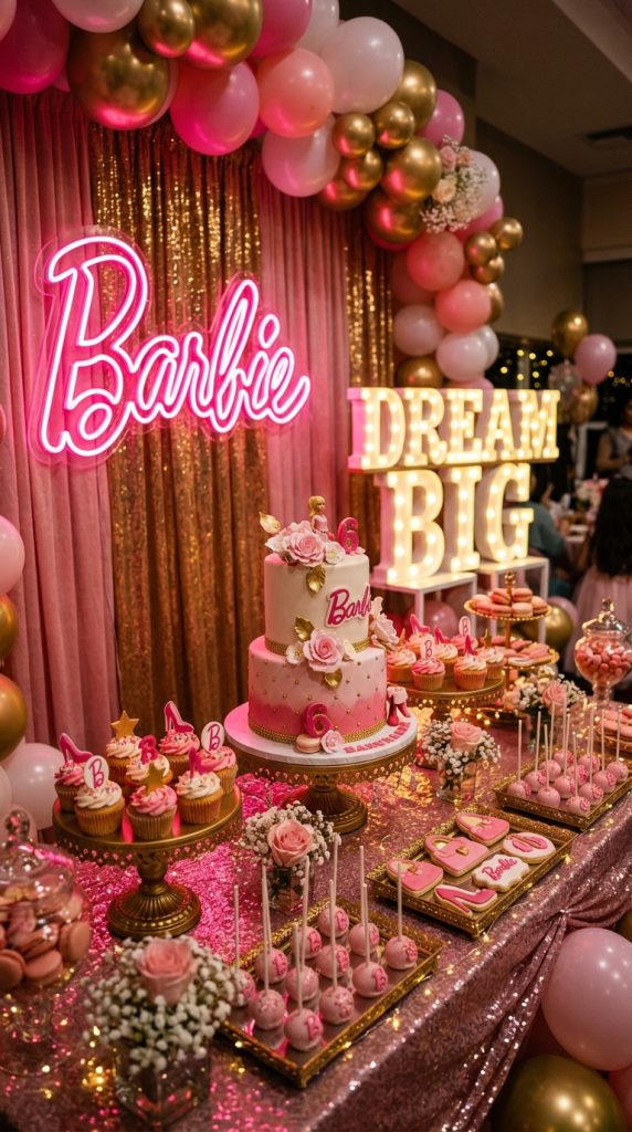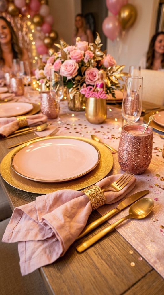 Encourage guests to lean into the aesthetic by wearing Barbie-inspired outfits in pink and gold tones that complement the tablescape beautifully.