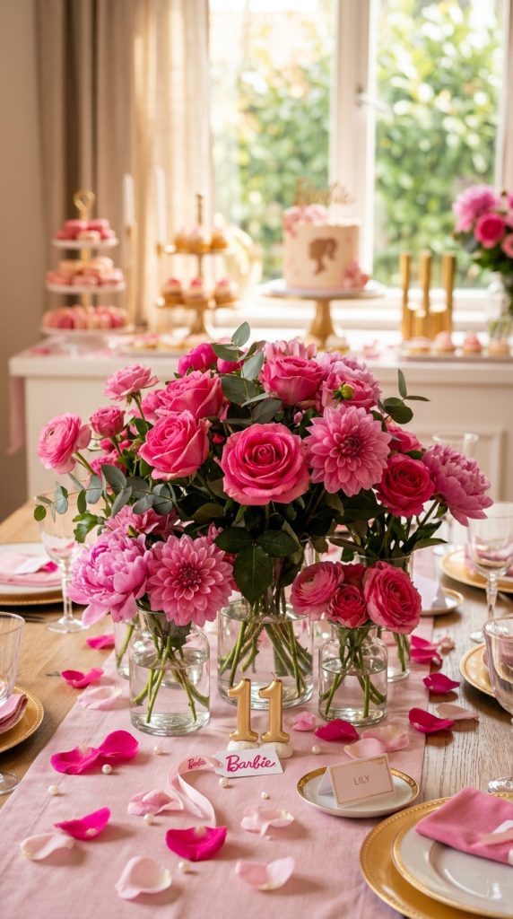 Don’t stop at centerpieces, though. Floral crowns make adorable party favors your guests will actually wear home. You can also create petal pathways leading toward your dessert table, guiding everyone straight to the good stuff. Hot pink blooms everywhere? Totally Barbie-approved.