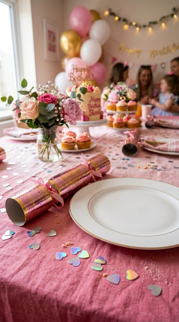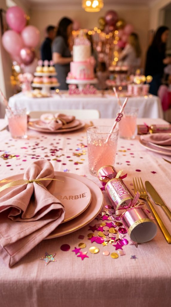 Party crackers and confetti are the finishing touches that pull your whole Barbie table together, and they’re more powerful than you’d think. Place metallic pink and gold party crackers beside each plate — they double as party favors guests actually want to keep.