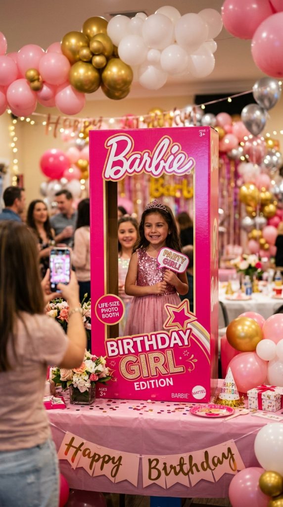You’ll create a life-size cardboard Barbie box frame that guests step behind for instant photo booth fun.