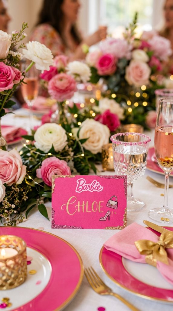 Gorgeous tableware sets the stage, but personalized place cards make guests feel genuinely seen — and DIY Barbie logo place cards do exactly that while adding another layer of that iconic pink aesthetic.