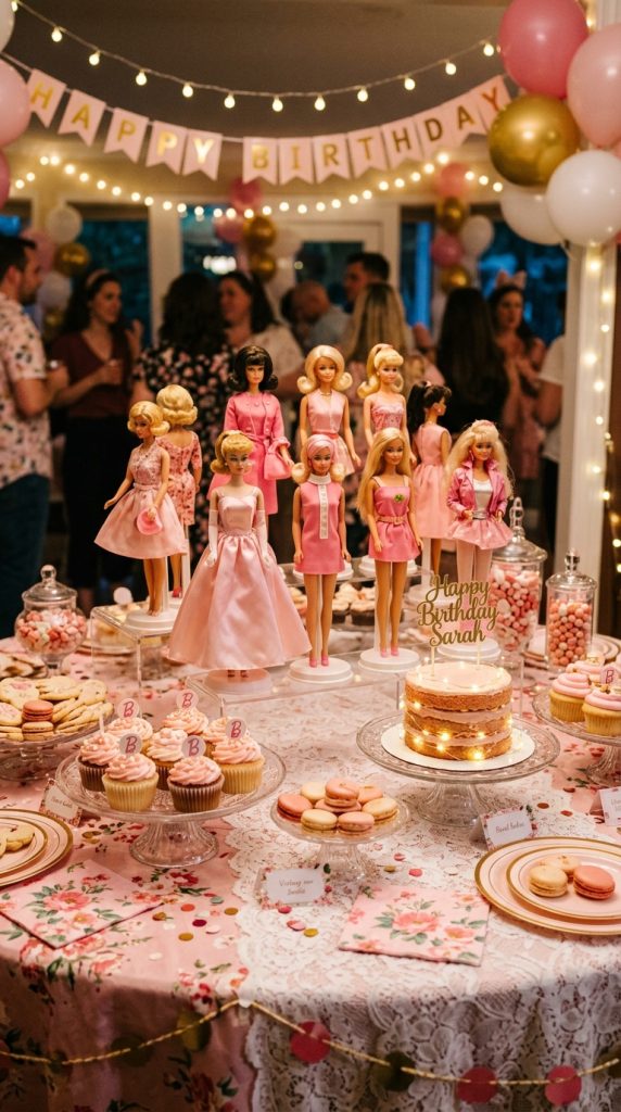 Mix decades intentionally — a 1960s Barbie beside a 1980s one adds nostalgic flair that older guests will genuinely love. Dress them in coordinating pink outfits to tie everything together visually.