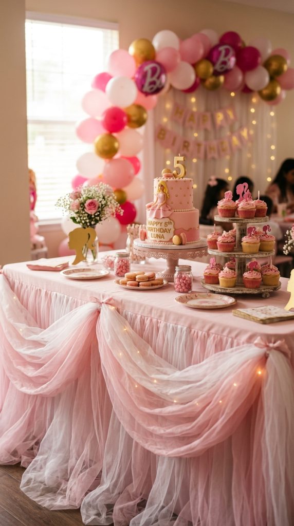 Tulle is the secret weapon of Barbie table decor, and it’s surprisingly easy to work with. Simply gather several yards of pink or white tulle and drape it loosely along the table’s edge for instant tulle draping magic.