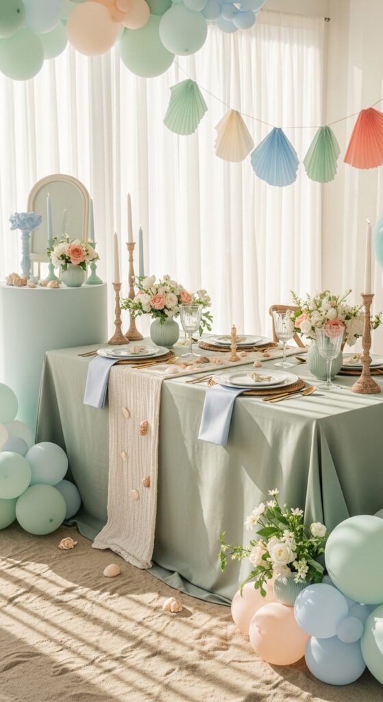 Soothing pastel hues create that perfect seaside atmosphere without overwhelming your space. Try mixing powder blue with pale coral, or combine mint green with buttery yellow for a sunrise-inspired look. These gentle tones photograph beautifully and won’t clash with your guests’ outfits.
